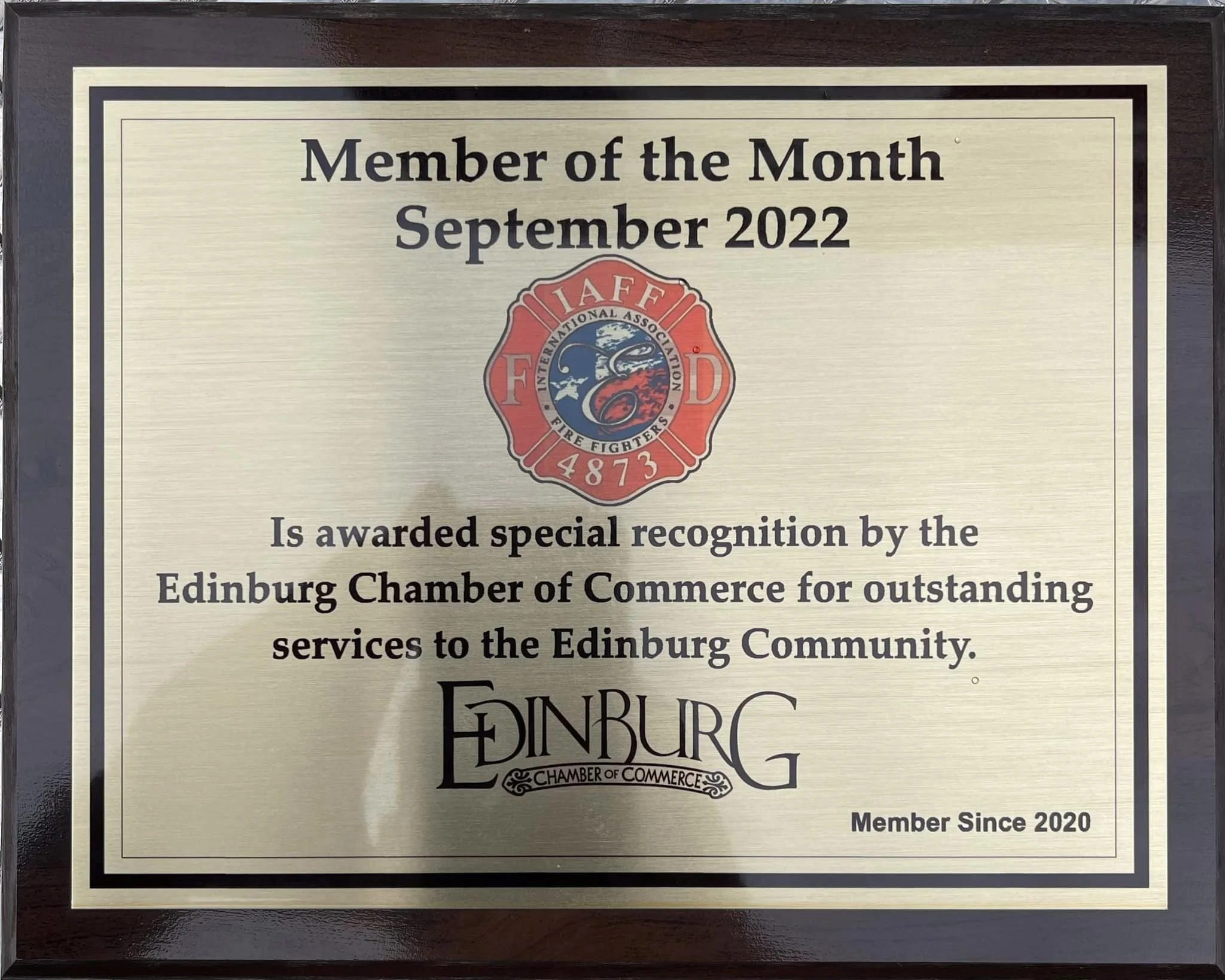 The Edinburg Professional Firefighters Association Local 4873 is a proud member of The City of Edinburg’s Chamber of Commerce. Local 4873 was awarded “Member of the Month” for the month of September 2022.